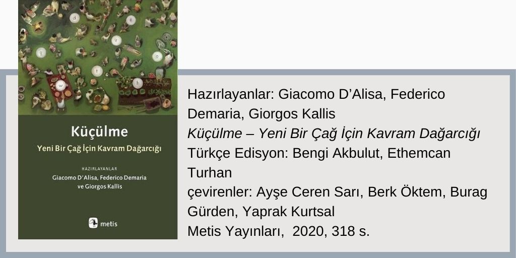 Küçülme – Yeni Bir Çağ İçin Kavram Dağarcığı kitabı aslında tam ihtiyaç duyulan zamanda küçülme ekonomisiyle ilişkili kavramların tanınmasını ve kullanımının yaygınlaşmasını hedefliyor. Yer yer genel okur kitlesine hitap etme kaygısı gütmese de bunu önemli ölçüde başarıyor. Bununla birlikte kitabın tamamı değerlendirildiğinde daha heyecan verici bir işleve de sahip: Yeni bir ekonomi, yeni bir toplum ve yeni bir yaşam tarzına dair özerk bir tahayyülün tasvirini yapıyor. Başka bir deyişle diğer akımların uzun süredir yapmakta zorlandığı bir şeyi yaparak somut önerilerle gelecekten ümit verici bir şekilde bahsediyor. Söz konusu tahayyülü güçlendirmek ve hayata geçirmek için atılacak ilk adım ise kanıksanmış, sorgulanmayan ve zararlı kavramların ipliğini pazara çıkarmak, “Büyüme” gibi…
