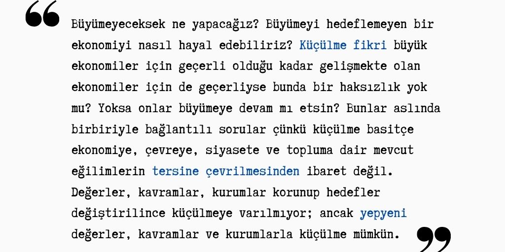 “Küçülme kelimesinin amacı, büyüme kavramının otomatik olarak ‘daha iyi’ ile özdeşleştirilmesini alaşağı etmektir. Küçülmecilere göre, farklı bir geleceğe dair bir tartışmanın açılabilmesi, büyümenin sorgusuz bir biçimde arzu edilir olduğu yolundaki genel kanıya karşı çıkılmasını gerektirir.” (s. 23)
