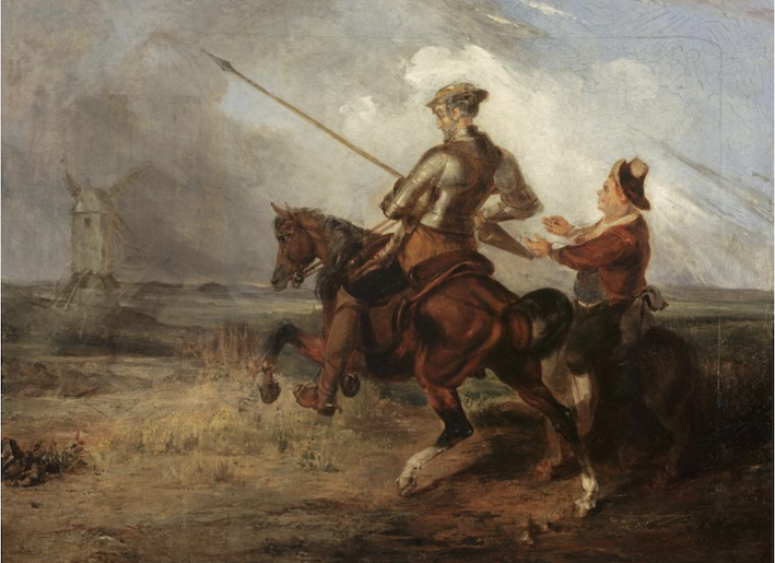 Portrelerin ve tarih resimlerinin ressamı William Stewart Watson’ın “Don Quixote Tilting at a Windmill” (1832) isimli çalışmasında, Don Kişot’u yel değirmenlerine saldırmak üzere harekete geçerken görürüz. Sanço’nun elleri ve duruşu ise efendisini gerçekliğe davet edişini anlatır.