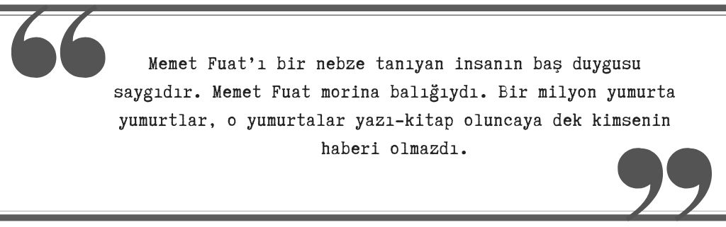 Memet Fuat’ı bir nebze tanıyan insanın baş duygusu saygıdır. Memet Fuat morina balığıydı. Bir milyon yumurta yumurtlar, o yumurtalar yazı-kitap oluncaya dek kimsenin haberi olmazdı.