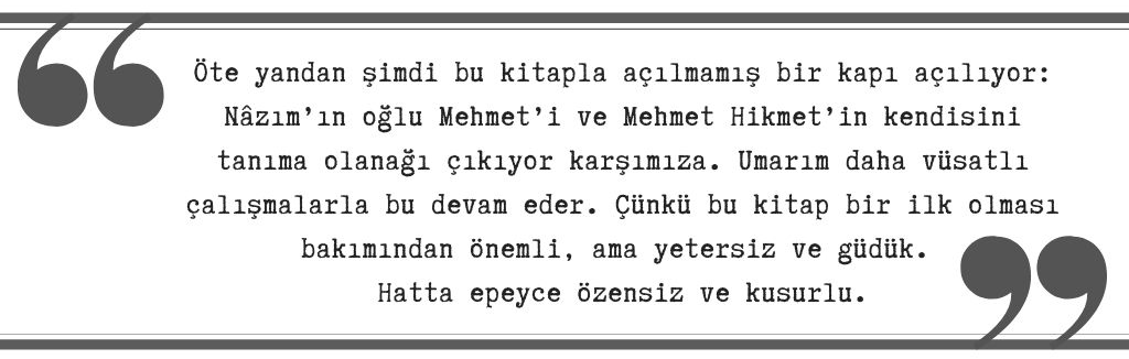 Öte yandan şimdi bu kitapla açılmamış bir kapı açılıyor: Nâzım’ın oğlu Mehmet’i ve Mehmet Hikmet’in kendisini tanıma olanağı çıkıyor karşımıza. Umarım daha vüsatlı çalışmalarla bu devam eder. Çünkü bu kitap bir ilk olması bakımından önemli, ama yetersiz ve güdük. Hatta epeyce özensiz ve kusurlu.