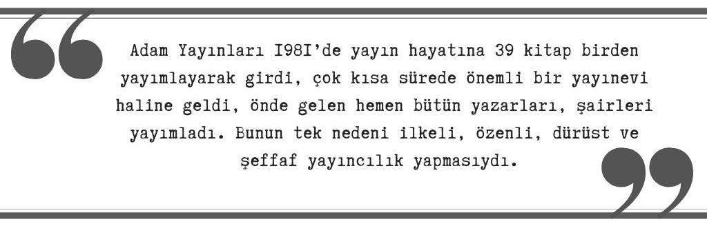 Adam Yayınları 1981’de yayın hayatına 39 kitap birden yayımlayarak girdi, çok kısa sürede önemli bir yayınevi haline geldi, önde gelen hemen bütün yazarları, şairleri yayımladı.
