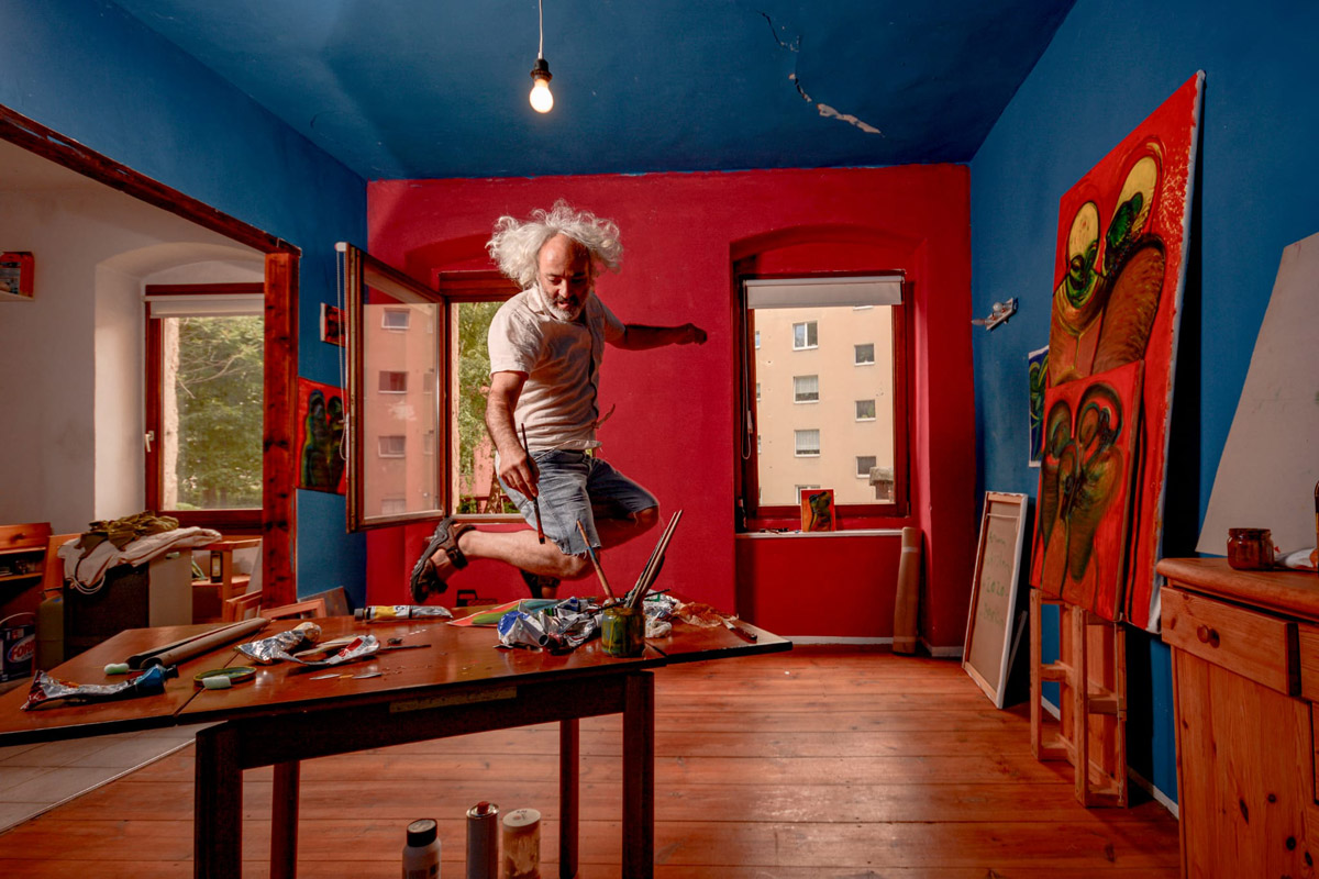 Berlin’in Schöneberg semtindeki yağlıboya tablolar, fırçalar ve ahşap çerçevelerle çevrili olan atölyesinde Arslan çarpıcı mavi bir duvarın önünde, eski bir ahşap sandalyede mütevazı bir şekilde oturuyor. İnce belli bardaklardan sıcak çaylarımızı yudumlarken sohbetimiz derinleşiyor.