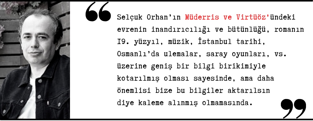 Şu noktanın da altını mutlaka çizmek gerekir. Selçuk Orhan’ın Müderris ve Virtüöz’ündeki evrenin inandırıcılığı ve bütünlüğü, romanın 19. yüzyıl, müzik, İstanbul tarihi, Osmanlı’da ulemalar, saray oyunları, vs. üzerine geniş bir bilgi birikimiyle kotarılmış olması sayesinde, ama daha önemlisi bize bu bilgiler aktarılsın diye kaleme alınmış olmamasında. Selçuk Orhan, önceki romanlarında da atmosfer yaratmakta (ve sürükleyici bir olay örgüsü kurup sürdürmekte) çok başarılıydı. Müderris ve Virtüöz’de de tarihî atmosfer bizi hemen içine alıyor ve roman boyunca orada tutmayı başarıyor. Roman kişilerinin muhakeme ya da diyalogları, birbirleriyle girdikleri fikir tartışmaları, bir şeyler öğrenme peşindeki iki başkahramanın soru ve sorgulamaları metnin sürükleyiciliğini engellemediği gibi, romanın atmosferini güçlendirirken metne olay örgüsüyle paralel ilerleyen düşünsel bir akış kazandırıyor. Bu akışın dümdüz ilerlemediğini, olay örgüsü gibi inişli çıkışlı yürüdüğünü, nihayetinde mutlak, nihai sonuçlara varmadığını, ama bunlara kafa yormak konusunda bizim için de kışkırtıcı olduğunu eklemeliyim.