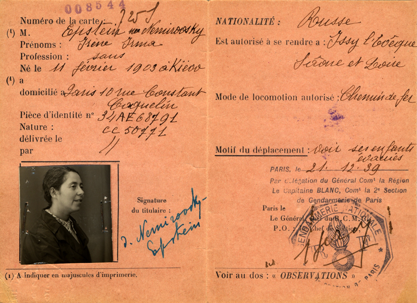 Iréne Némirovsky. Solda, toplama kampına götürülmelerini son anda engelleyebildiği kızlarıyla: Denise Epstein ve Élisabeth Epstein. Arka planda: Auschwitz Toplama Kampı’nda Yahudi kadınlar, 1942.