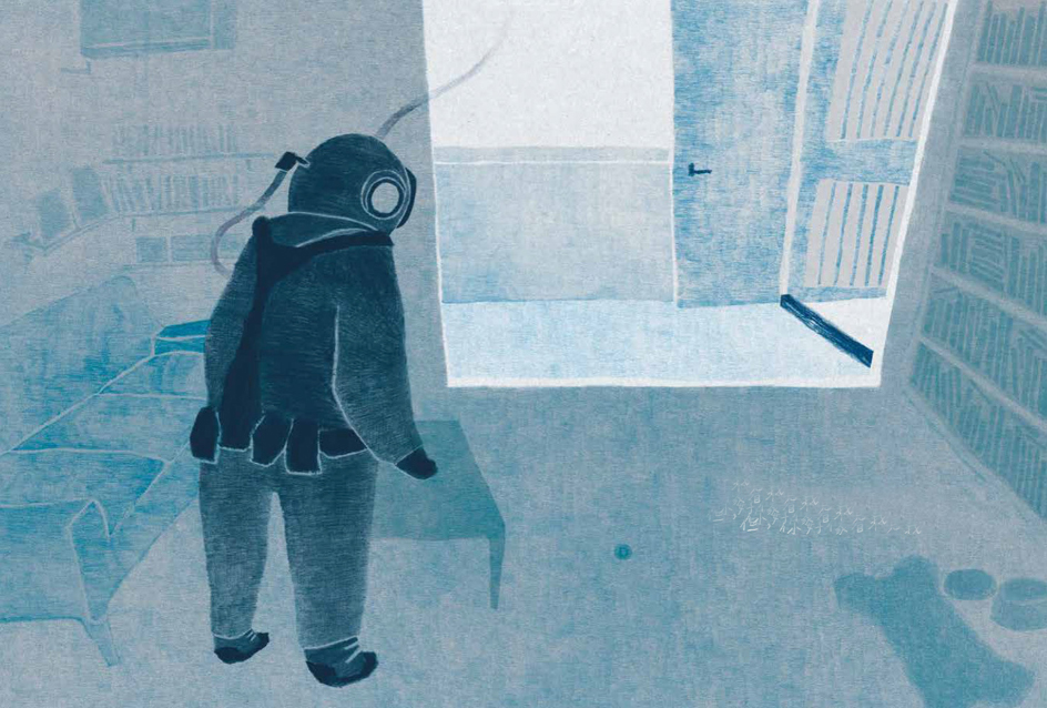 “İklim krizi nedeniyle sular altında kalmış bir şehir... Olduğu gibi karanlığa gömülmüş binalar, yollarda bırakılmış arabalar, artık bir şey ifade etmeyen reklam panoları, kesilmiş ağaçlar, iş makineleriyle bir yandan hüzünlü bir ıssızlık, bir yandan sular çekilse yaşam sanki kaldığı yerden devam ediverecekmiş gibi bir his… Masmavi sayfalarda (kentte) ağır ağır yüzen balıklar, balinalar arasında yürüyen bir adam…”