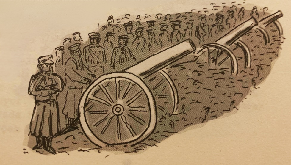 Günümüzde de ablukalar, kuşatılarak dış dünyadan izole edilen şehirler az değil. Çok yakınlarda Gazze’de yaşananlara bütün dünya tanık oldu mesela. Kuşatmalara eşlik eden bir görüntü de kitlelerin kuşatılan bölgenin içerisinde bombalardan biraz daha uzak olacaklarını umdukları yerlere kaçmaları. Angèle Guéron’ın günlüğünün başlarında da Edirne’den Karaağaç’a kaçma sahnesi yer alıyor. Onun çizdiği şu görüntünün benzerini maalesef günümüzde de sıklıkla görüyoruz ekranlarda.