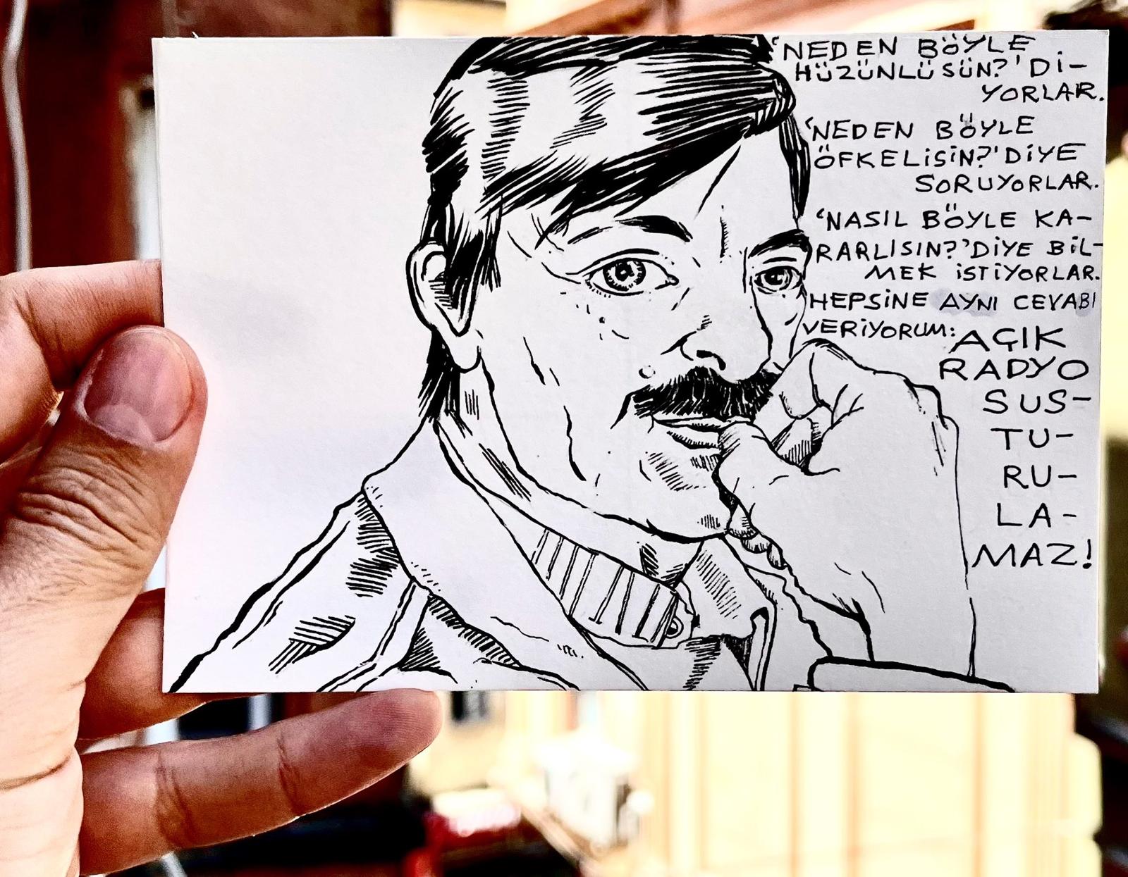 Açık Radyo’nun hayatımdaki yerinden ziyade, ben kendimi Açık Radyo’nun hayatında bir yer, bir parça olarak görüyorum. Yıllara yayılan birliktelikle iç içe geçmişiz, bir olmuşuz. Özellikle resim yaparken, atölyemde en büyük eşlikçim. Bu şekilde yaptığım çalışmalara baktığımda kulağıma o an dinlediğim programlar gelir ve çok keyif alırım. Aynı zamanda etrafımda küçük küçük notlar uçuşur; ya bir isim, ya bir cümle, ya da bir şarkı adı. Öyle çok şey öğrendim, öyle çok insanla tanıştım ve kendime kattım ki… Nezaketle konuşma, sevgiyi, tutkuyu veya öfkeyi, korkuyu paylaşma, can kulağıyla dinleme, merakla öğrenme ve en çok da yalnız olmadığını hissetme… Depremler, yangınlar, pandemi… Dışarının en ufak kaosunda hemen radyomu açtım; doğru bilgiye ulaşmak, dayanışmak ve direnebilmek için. Tüm bunlar aslında çok daha fazla söyleyebileceklerimin küçük bir kısmı ve bu anlamda radyonun susturulmaya çalışılması evimin içine girip müdahale edilmiş gibi hissettiriyor. Şu an atölyedeki sessizlik RTÜK’le baş başa oturuyormuşum gibi beni sinirlendiriyor ama çok derinden radyonun susturulamayacağını bildiğim için bu beyhude çabalarına acıyorum. Açık Radyo sadece bir frekans ya da bir kayıt stüdyosu değil, bir oluş şekli ve buna kimse engel olamaz. Açık Radyo aslında hâlâ açık; açık kalmaya da devam edecek.