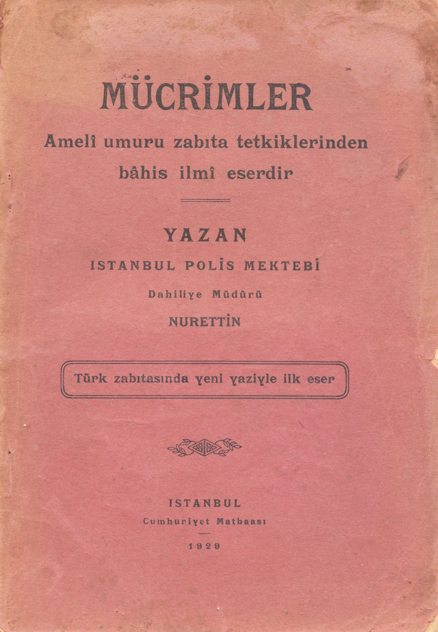 Sözünü etmek istediğim ikinci kitap, “İstanbul Polis Mektebi Dahiliye Müdürü” Nurettin (Gökmen, 1891–1959) tarafından yazılmış, Mücrimler: Amelî Umuru Zabıta Tetkiklerinden Bâhis İlmî Eserdir başlığını taşıyor. İstanbul’da, Cumhuriyet Matbaası’nda 1929’da basılmış, yani Lâtin harflerine geçildikten kısa süre sonra. Nitekim künye sayfasında “Türk zabıtasında yeni yaziyle ilk eser” ibaresi var. Ankara Polis Akademisi 2019’da tıpkıbasımını yayınlamış.