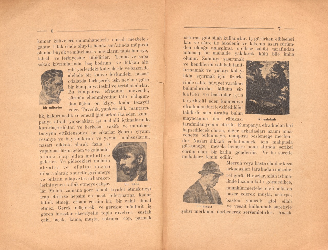 Gerçekten de kitapta bir hayli görsel malzeme var, kimi fotoğraf, kimi çizim. Bazıları imzalı olmakla beraber sanatçıların adları malesef verilmemiş. Keşki verileydi. Genel olarak çok hoş resimler, ve dönemlerini yansıtıyorlar – örneğin insanların suçluluklarının görünüşlerine yansıdığı düşüncesine dayanıyorlar. Oysa öyle değil elbette. Hatırlarım, bir keresinde hava alanında beni bir odaya almışlar, üstümü başımı, eşyamı didik didik etmişlerdi. Tam da habire uçak kaçırılan zamanlardı. Sonunda polise sordum, “Yahu, teröriste benziyor muyum ben?” diye. Adam “Vallahi, benzemiyorsun da, terörist neye benziyor, bilmiyoruz ki!” demişti. Haklıydı tabii, suçluları görünüşlerinden tanımak keşki o kadar kolay olaydı…