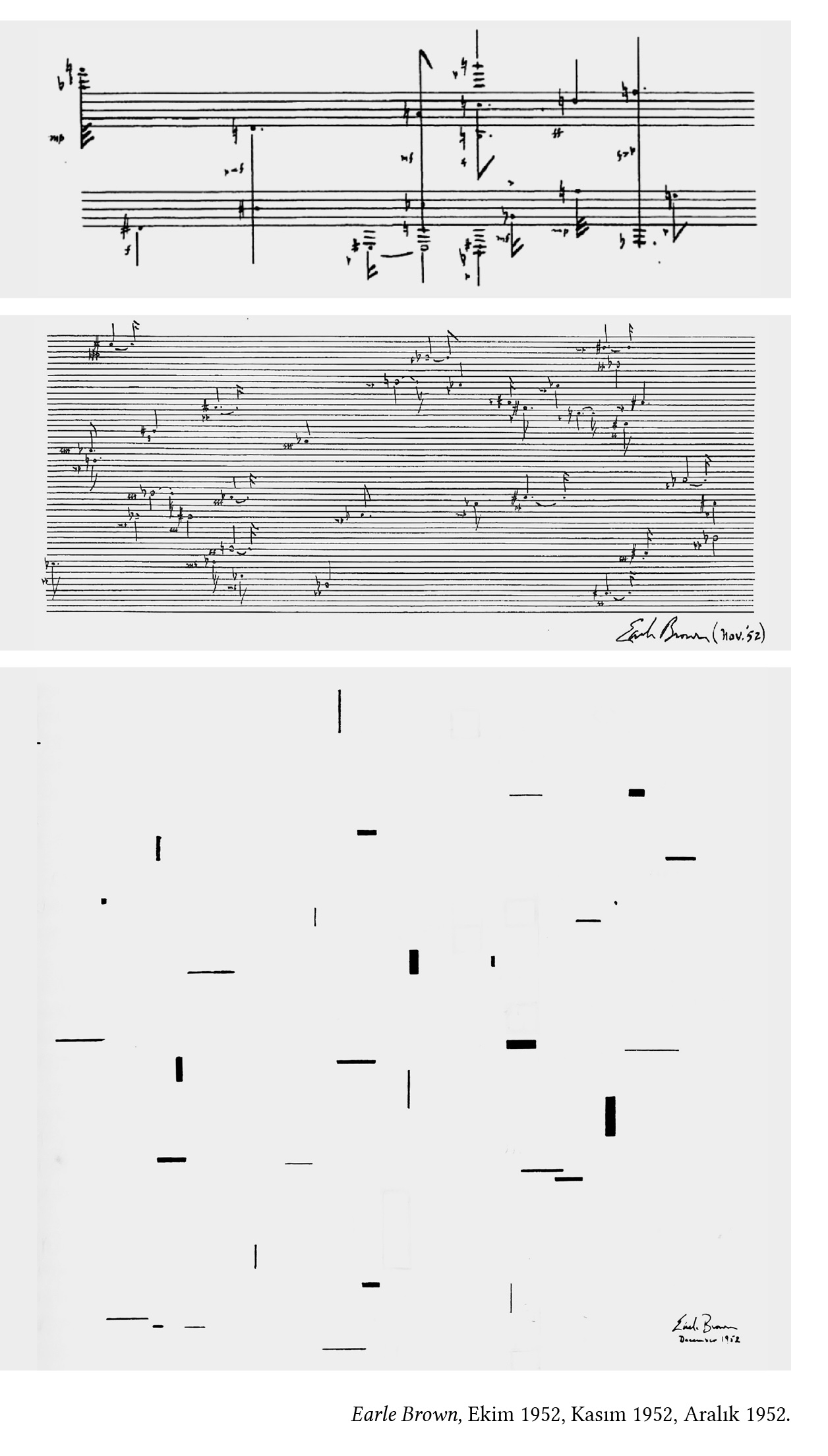 A.K.: Bu sohbetimizde özellikle 1952-1954 arasındaki çalışmaları üzerinde duracağız. En sonunda 1964’teki bir çalışmasına da bakacağız. Ama asıl Brown’ın öncü çalışmaları 1952-1954 arasında ortaya çıkıyor. Bunların en başında da 1952 yılında yazdığı Folio dizisi yer alıyor. Folio dizisi üç adet tek sayfalık grafik partisyondan oluşan bir toplam. Her birinde grafik notasyon kullanılan üç ayrı sayfadan oluşuyor Folio. Bu grafik notasyonlara baktığımızda çalgı ortamlarının belirtilmemiş olduğunu görüyoruz. Ama her üçü de kendi içinde farklılaşıyor, onlara bakacağız. Bunların içinde özellikle de üçüncüsü son derece büyük bir önem taşıyor. Bunların her biri 1952 yılında bestelendikleri tarihi gösteren bir adla adlandırılmış. İlki “Ekim 1952”, ikincisi “Kasım 1952” ve üçüncüsü de “Aralık 1952”. İlk çalışma olan “Ekim 1952”de, her şeyin notaya alındığını görüyoruz, ama sesler arasındaki boşluk süreleri yorumcuya bırakılmış. Yani daha önce de pek çok farklı örneğini gördüğümüz süreye ilişkin açıklığın “Ekim 1952”de ortaya çıktığını söyleyebiliriz.