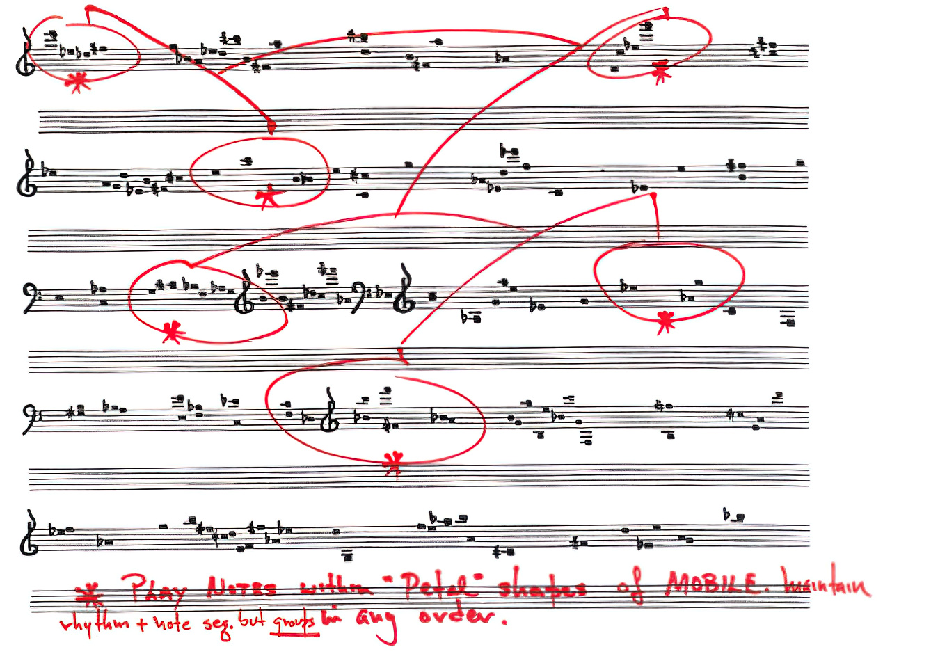 A.K.: Evet. Ama grafik notasyonu ellilerde en uç noktada, müziği temsil eden her türlü konvansiyonel öğeden soyutlayarak, arındırarak kullanan Earle Brown, bu kez Corroboree’yle, açıklığı sürdürmesine, yine açıklık özellikleri taşıyan bir yapıt yazmasına rağmen, konvansiyonel yazıya geri dönüyor. Partisyonda dizeklerin, anahtarların, geleneksel ses perdelerinin tekrar yer aldığını görüyoruz. Ama tabii düşey ilişkilerde yine bir özgürlük alanı yaratıyor.