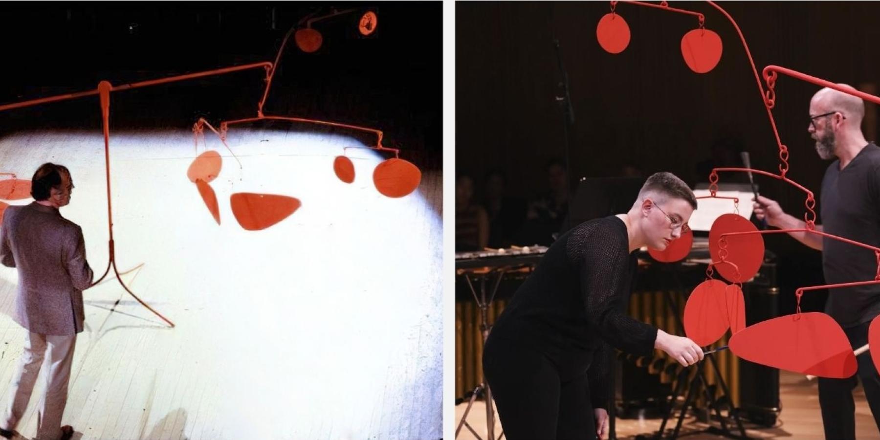 Solda: Earle Brown, Calder Piece adlı yapıtı için Calder’in ürettiği mobil ile birlikte. Sağda: Calder Piece’in Talujon Percussion Quartet tarafından icrasından.