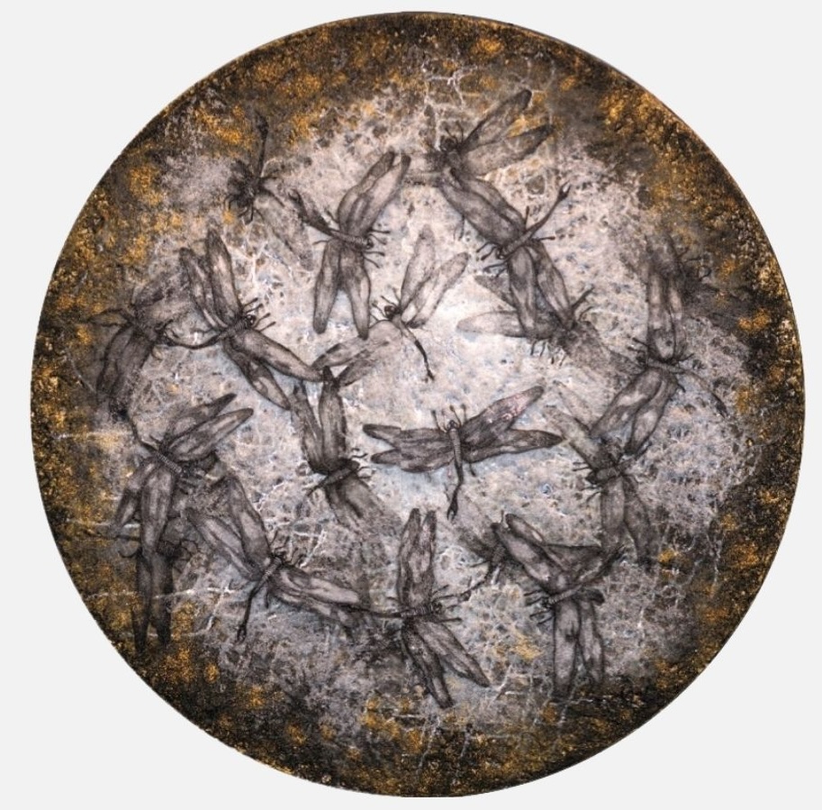Alpay, konularını ne anlama geldikleri için değil, ne yaptıkları için seçer. O yüzden de örneğin Yusufçuk’un hangi kültürde neye tekabül ettiği onu çok ilgilendirmez. Aslında her motif bir süreç dersidir: Işığın saydamlıkta nasıl davrandığı, biçimin basınçtan nasıl doğduğu, zamanın yüzeyi nasıl değiştirdiği üzerine. Yusufçuk süzülür; mantar çoğalır; yaprak nefes alır; kömür hatırlar; diken savunur; çiçek yanıt verir. Ortak paydaları güzellik değil, metabolizmadır — hareket halindeki maddenin zekâsı.