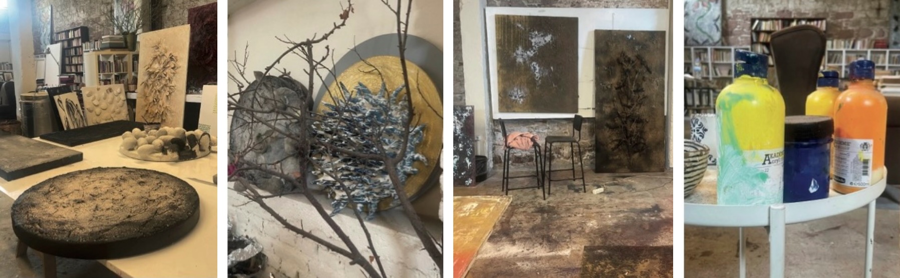 Elvan Alpay’ın atölyesi, bu ex materia ilkesinin örneğidir. Onun işi maddeye biçim dayatmaz; onunla müzakere eder. Akrilik yoğunlaşır, toplanır; pigment dağılır, kurur; cam tozu ışığı kırar, sonra çöker. Sanatçı gözlemler, ayarlar, müdahale eder, bekler. Her karar, malzemelerin kendilerine özgü bir halleri olduğunu kabul eder —onların da en az niyet kadar karmaşık iç yasaları vardır. Ortaya çıkan şey önceden belirlenmiş bir kompozisyon değil, bir işbirliğinin kaydıdır. Yapıt, insanla insan-olmayan aktörler arasındaki konuşmanın görünür izi haline gelir.