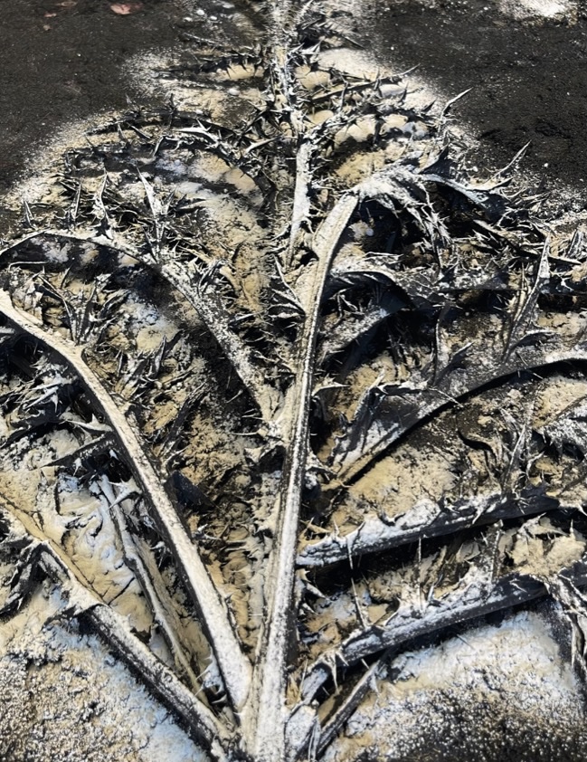 Kömür ve diken, belleği ve gerilimi içeri alır. Kömür, fosilleşmiş ışıktır —zaman içinde sıkışmış kara madde. Alpay’ın ellerinde endüstri ya da kirlilik sembolü olmaktan çıkar; dönüşümün kaydı haline gelir: Bitkiden minerale, enerjiden kalıntıya, yaşamdan pigmente geçiş. Diken ise bunun karşıt gücü, küçük bir direnç jestidir. Çiçek açarken diken büzülür; ikisi de aynı metabolik mantığa aittir —koruma ve açığa çıkma arasında gidip gelen bir denge. Bu ikilik, Alpay’ın bütün işlerinde işleyen diyaloğun özüdür: Geçirgenlik ile savunma, saydamlık ile opaklık arasında sürekli bir salınım.