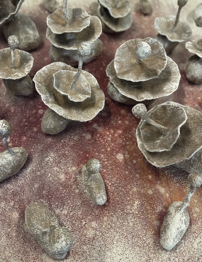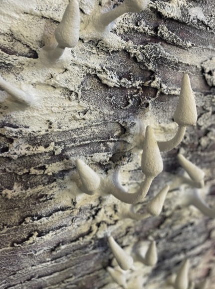 Mantar, bunun tam tersine, hayatın gizli dünyasına aittir. Çürüyüşten doğar, karanlıktan beslenir. Toprağın üstünde gördüğümüz mantar, yeraltında uzanan ağ ya da şebeke benzeri zekânın yüzeydeki yansımasıdır. Elvan Alpay’ın bireysel olanla kolektif olan arasındaki farkı yeniden yazan o miselyum yapısına duyduğu hayranlık, mantara duyduğu bu sürekli ilgi, bir anlamda bu paradoksun yankısıdır. Çözülerek büyümek, kırılganlıkla dayanıklılık kazanmak. Mantar, kendini tüketen bir sürecin en maddî organizmasıdır.