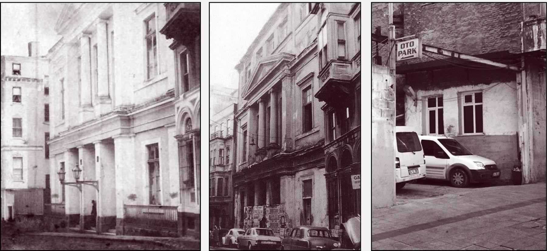 Solda: İstanbul Helen Edebiyat Cemiyeti binası, Beyoğlu, 1888. Ortada: Beyoğlu, Topçekenler Caddesi, 18 numarada bulunan ve 1965’te yıkılarak otopark yapılan İstanbul Helen Edebiyat Cemiyeti binasının 1960'lardaki fotoğrafı... Sağda bugünkü otopark.