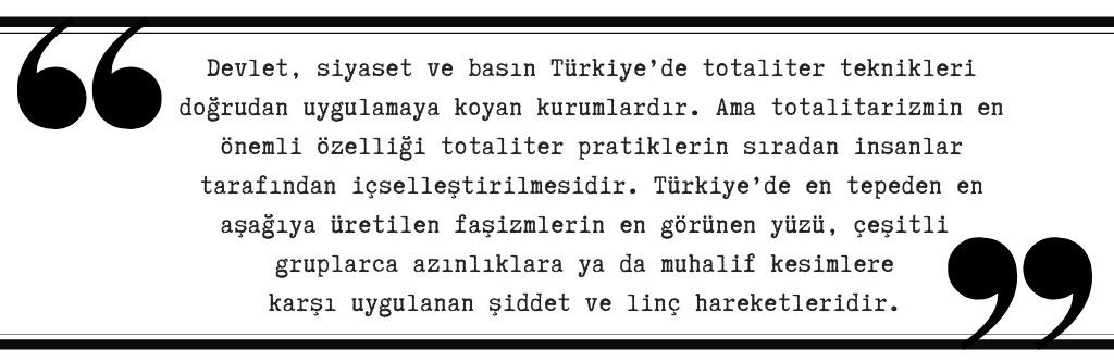 Türkiye’de adı ne olursa olsun, faşist ve totaliter pratiklerin sürekliliği dikkat çekicidir. Bu süreç, liderler ve partiler değişse de, “Kürt barışı”ndan, “Barış süreci”nden söz edildiği 2002-2012 dönemi hariç, kesintiye uğramadı. Osmanlı saltanatında rastlanan çeşitli baskı yöntem ve teknikleri, modernleşme çabalarındaki imparatorluğun İttihat Terakki döneminde gerçekleşmiş Ermeni kırımı gibi olaylar bir kenara bırakılırsa, Cumhuriyet Türkiyesi’nin ilk döneminde “yeni toplumu” ve “yeni insanı” yaratmak üzere atılan adımlar bu totaliter pratikler çerçevesinde değerlendirilebilir. Kısaca değinecek olursak, dünyanın en iyi niyetli ve mükemmel sonucunu elde etmek için yapılmış olsalar bile, modernleşme ve Batılılaşma için gerekli görülen reform çalışmaları (kılık-kıyafet, harf inkılabı vb.) toplumun özgür seçimiyle değil, yukarıdan aşağı dayatıldı. Daha da sert adımlar sermayenin “millileştirilmesi” yönünde atıldı; Müslüman olmayan azınlıklardan Müslümanlara doğru sermaye kaydırıldı. Örneğin Varlık Vergisi –laik olduğunu iddia eden bir toplumda–Müslüman kitlelerin de dahil edildiği, faşist bir pratik olarak ortaya çıktı; geniş Müslüman kitleler devletin attığı bu adımı kolaylıkla benimsediler; vergilerini ödeyemeyen gayrimüslimlerin ucuza elden çıkarmak zorunda kaldıkları mallara sahip oldular.