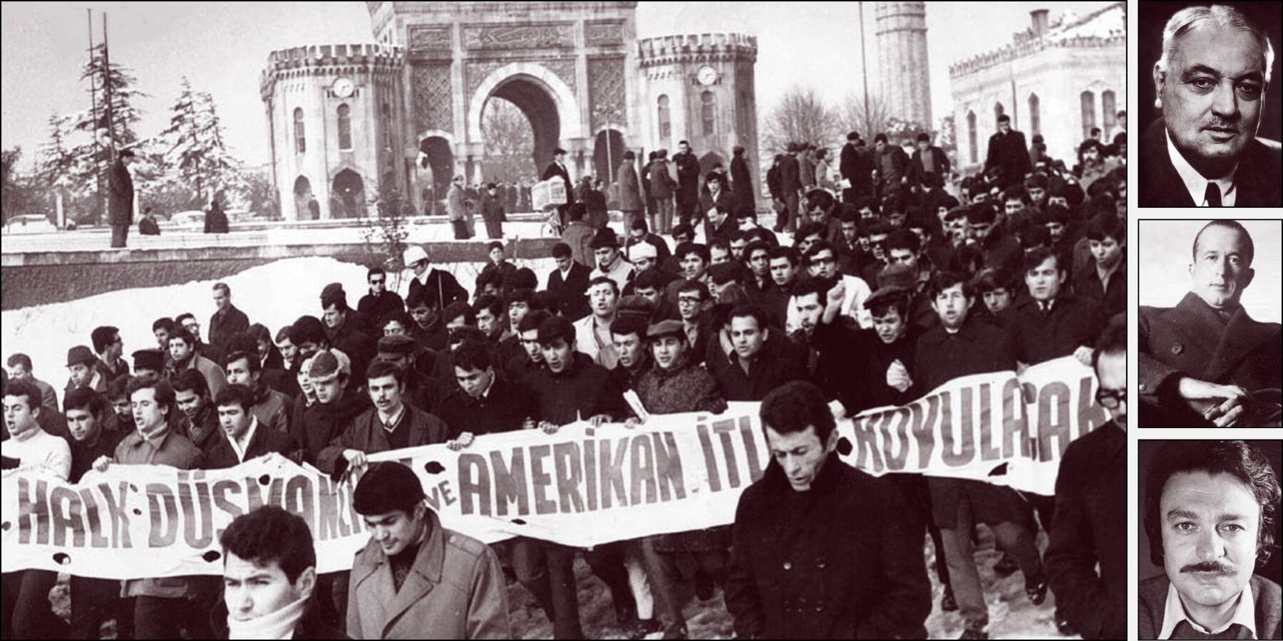 6. Filoyu Protesto Yürüyüşü, Beyazıt Meydanı, 1968. / Yukarıdan aşağıya: Yahya Kemal Beyatlı, Nahid Sırrı Örik, Oğuz Atay.