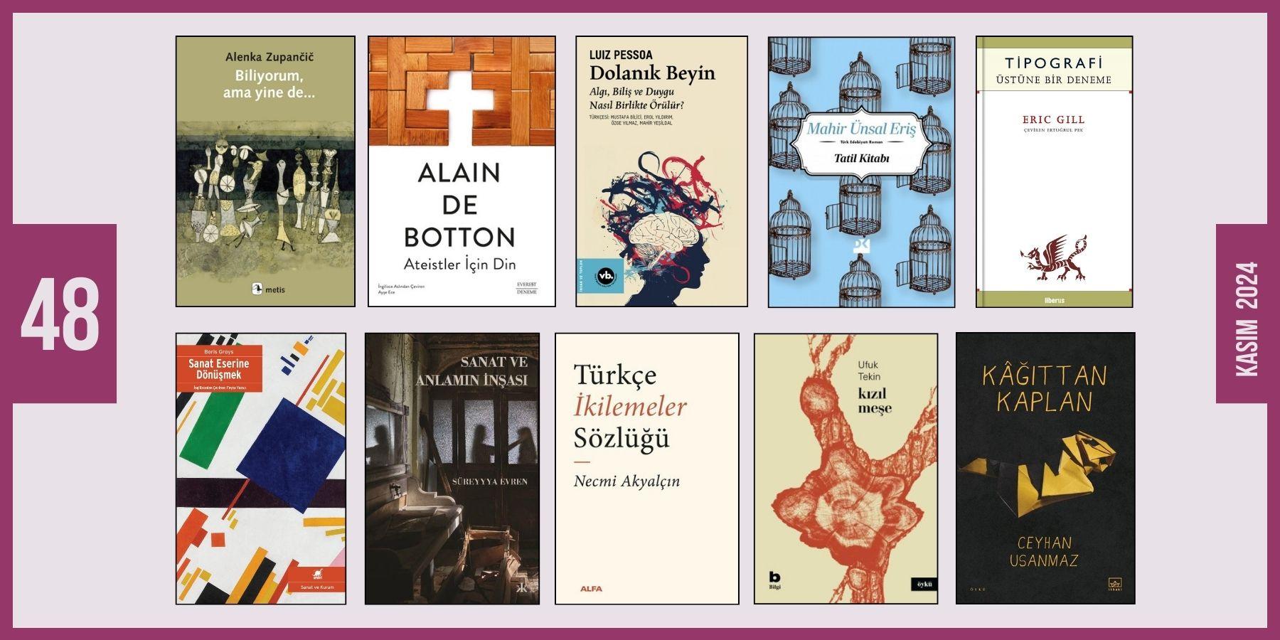 Yeni çıkan, yeni baskısı yapılan, yayınevlerince bize gönderilen, okumak ve üzerine yazmak için ayırdığımız bazı kitaplar: Ateistler için Din / Biliyorum, Ama Yine de… / Dolanık Beyin / Kâğıttan Kaplan / Kızıl Meşe / Sanat Eserine Dönüşmek / Sanat ve Anlamın İnşası / Tatil Kitabı / Tipografi / Türkçe İkilemeler Sözlüğü