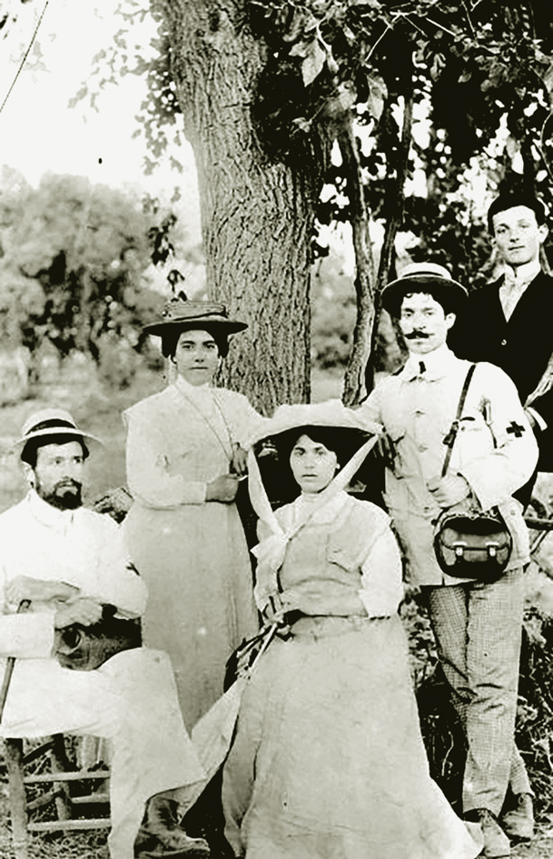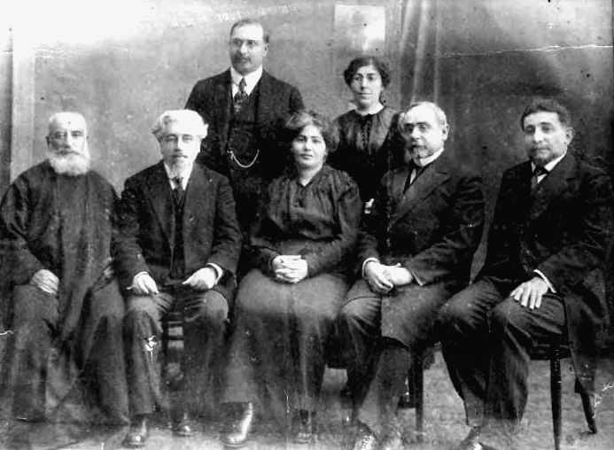 1915’ten önce İstanbul’da çekilmiş bir fotoğrafta Zabel Yesayan (ortada) Krikor Zohrab’ın da (en sağda) aralarında bulunduğu edebiyatçılarla birlikte.